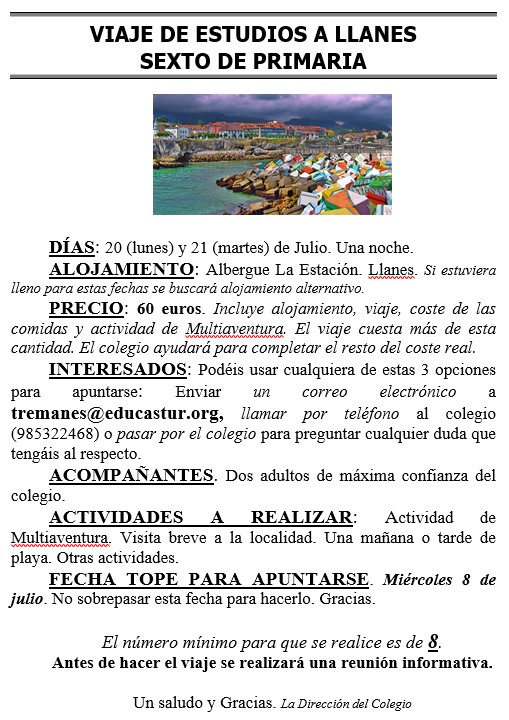 Tal y como se os adelantó en la reunión, os dejamos una propuesta de viaje de estudios para sexto de primaria.